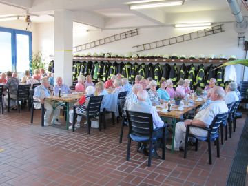 Mitglieder des Löschzuges Merfeld servierten den Teilnehmern Kaffee und selbstgebackenen Kuchen an den Tischen in der Fahrzeughalle. Bei herrlichem Wetter nahmen dann fast alle nach dem Kaffeetrinken ihre Stühle mit auf das schattige Außengelände hinter der Fahrzeughalle und bildeten hier eine große gemütliche Runde. Gereicht wurden noch kühle Getränke und zum Abend belegte Schnittchen. Mit Einbruch der Dunkelheit klang die Veranstaltung harmonisch aus.