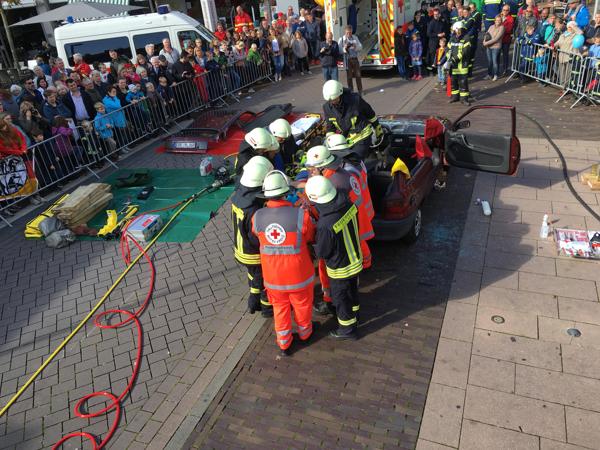 Der Löschzug Merfeld präsentiert in Zusammenarbeit mit dem DRK und R.U.N.D. eine Einsatzübung zum Thema „Technische Hilfe – Person klemmt“.