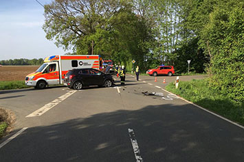 Am Donnerstag, 7. Mai, um 17.31 Uhr, wurden die Züge Dülmen-Mitte, Merfeld sowie die Hauptamtliche Wache zur Kreisstraße 44 in der Nähe von Merfeld gerufen. Nach einem Verkehrsunfall zwischen einem Pkw und einem Motorradfahrer, landete der Kradfahrer verletzt im Straßengraben. Nach der rettungsdienstlichen Versorgung wurde er über Steckleiterteile aus dem Graben befreit und mit dem Christoph Dortmund in eine Klinik transportiert.
